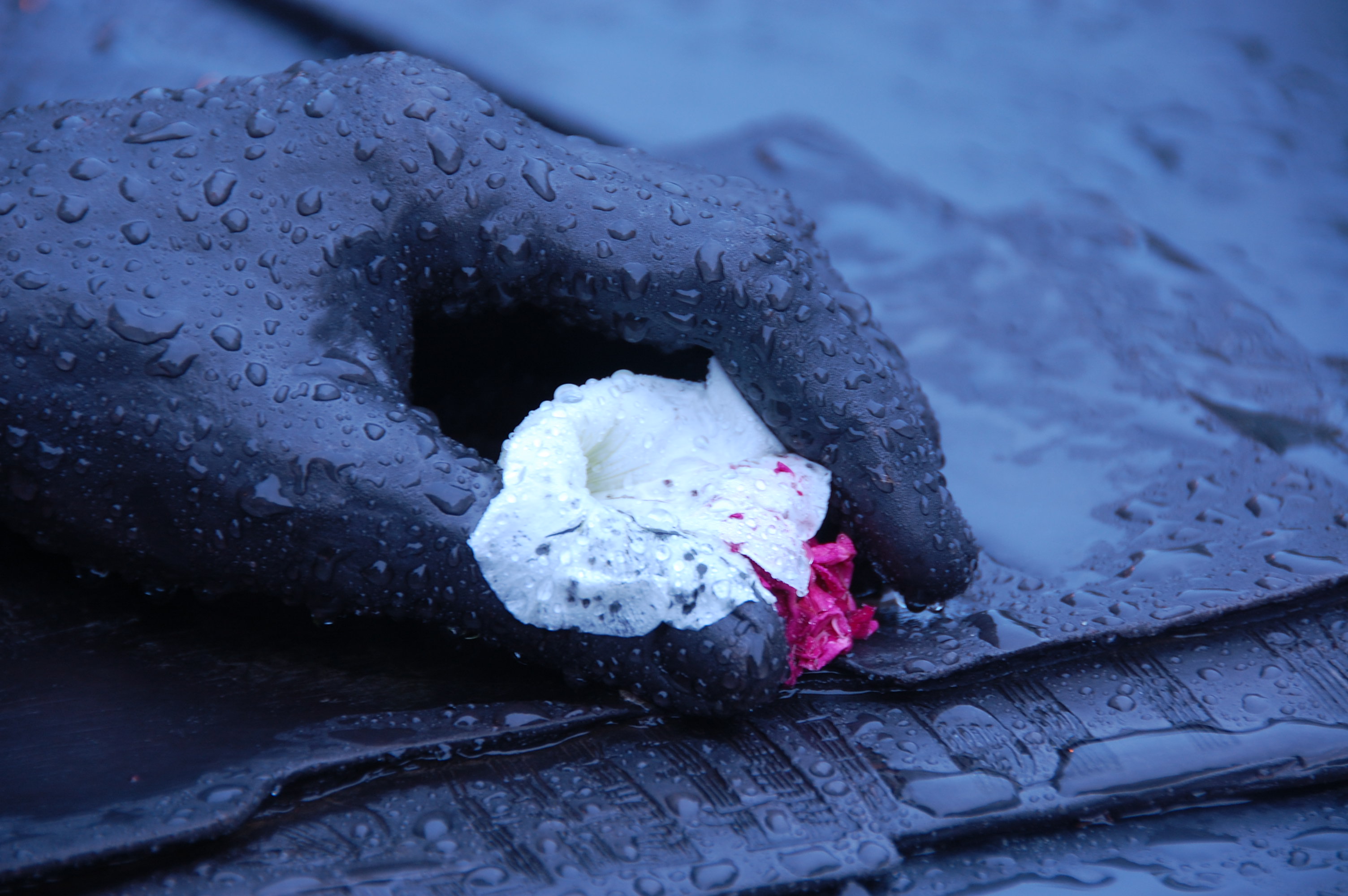 Tags: Auditorium, bloomington, bronze, hand, Hoagy Carmichael, Indiana, Indiana University, IU, petals, petunia, rain, statue