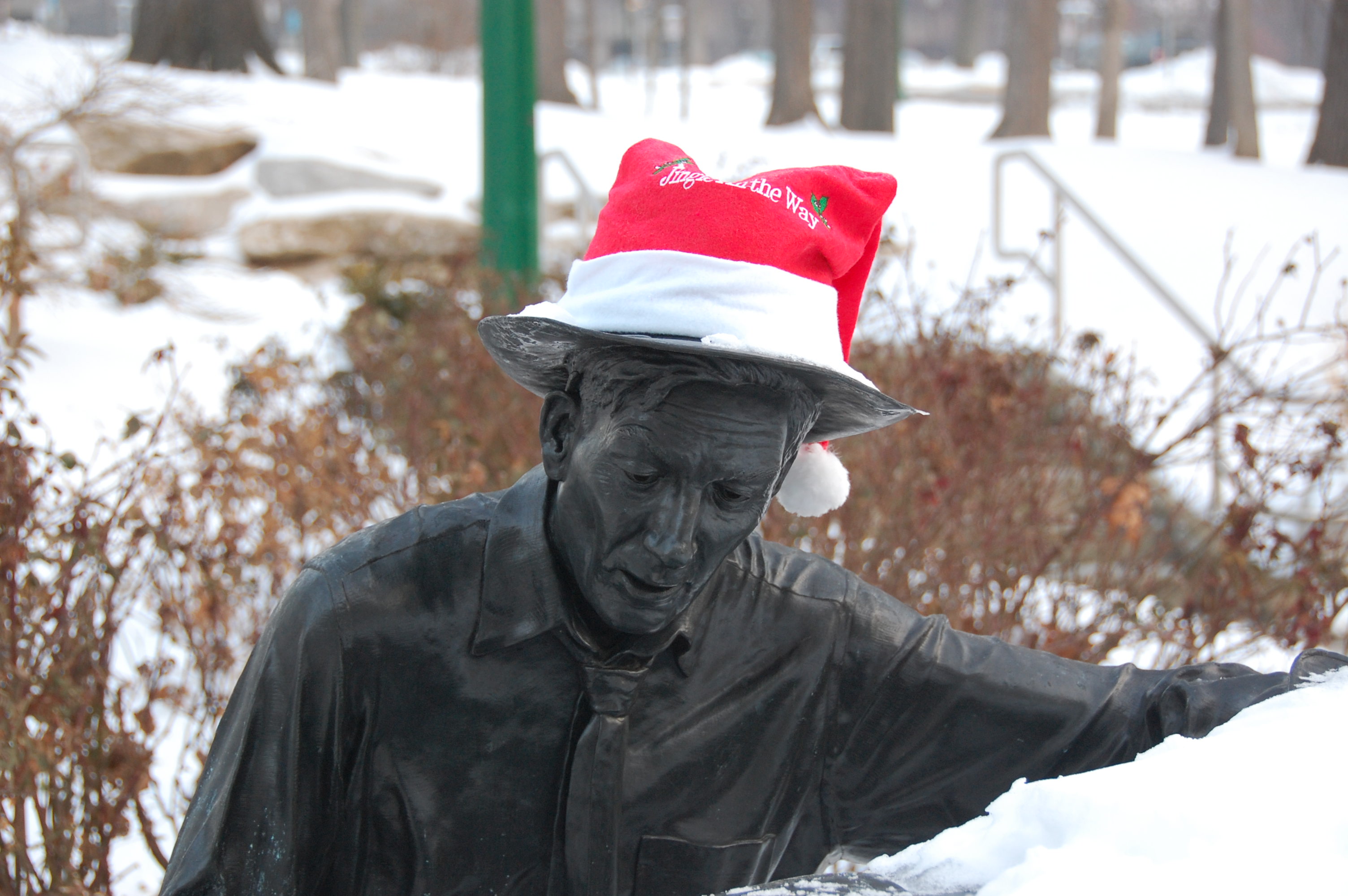 Tags: bloomington, bronze, hat, Hoagy Carmichael, IU, jingle, santa, snow, statue